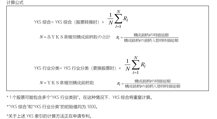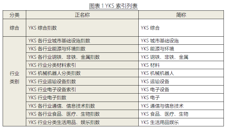 YKS指数由综合指数和行业分类指数构成。分类指数是根据YKS大分类(除“金融”外的11个分类)来选定技术高增长股票,并计算其值。综合指数根据每个行业指数的所有成份股计算其值。